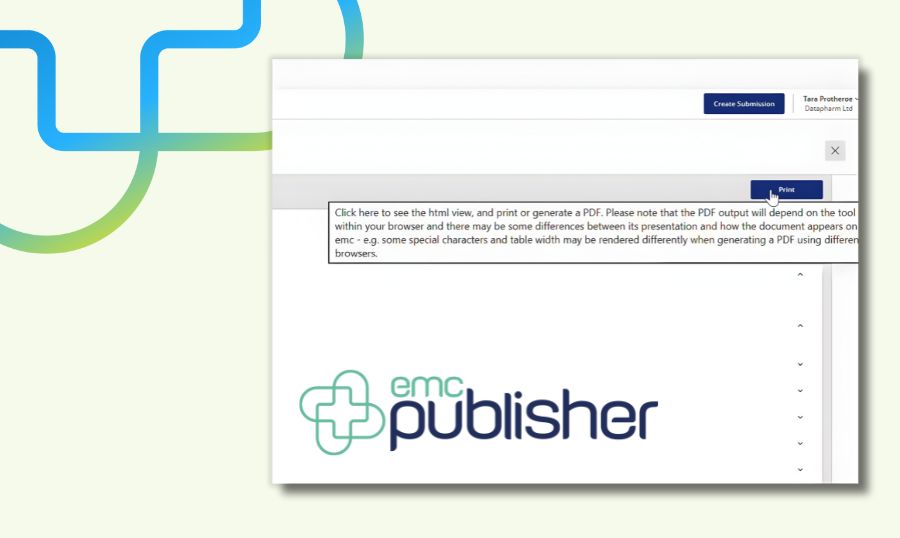 - On your side, as a publisher on emc: Print functionality at SmPC approval stage, allowing you to generate a PDF of the converted document to assist with your final checks