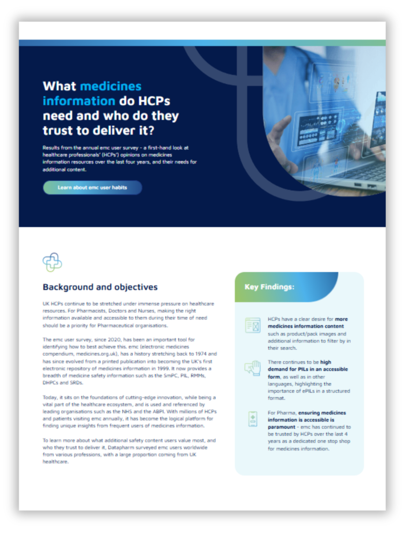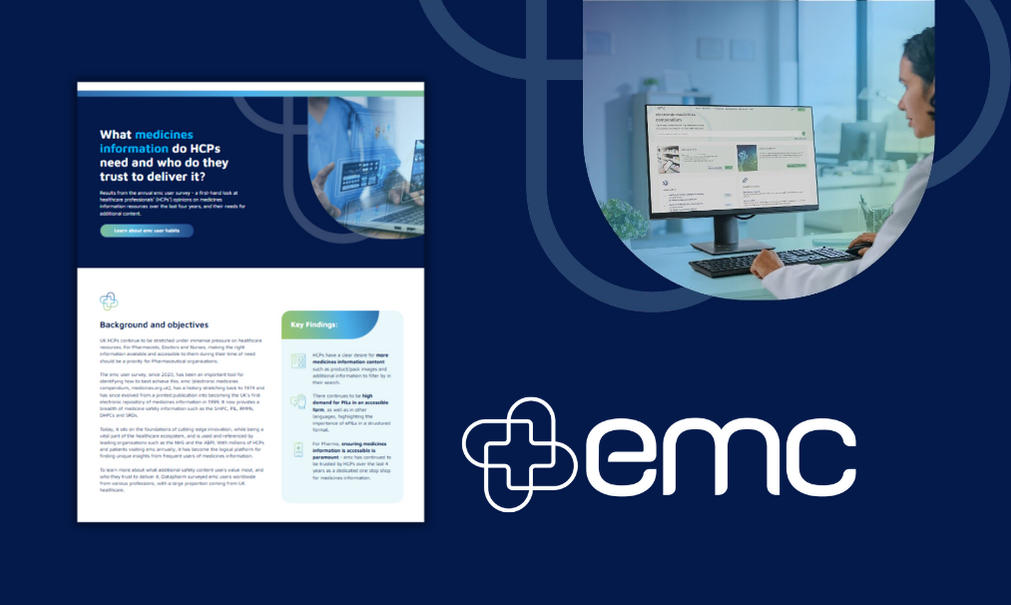 Since 2020, the annual emc user survey has been an important resource for identifying how to best meet HCPs' needs for medicine information content. With millions of HCPs and patients visiting emc (electronic medicines compendium, medicines.org.uk) annually, it has become the logical platform for finding unique insights from these frequent users of medicines information.