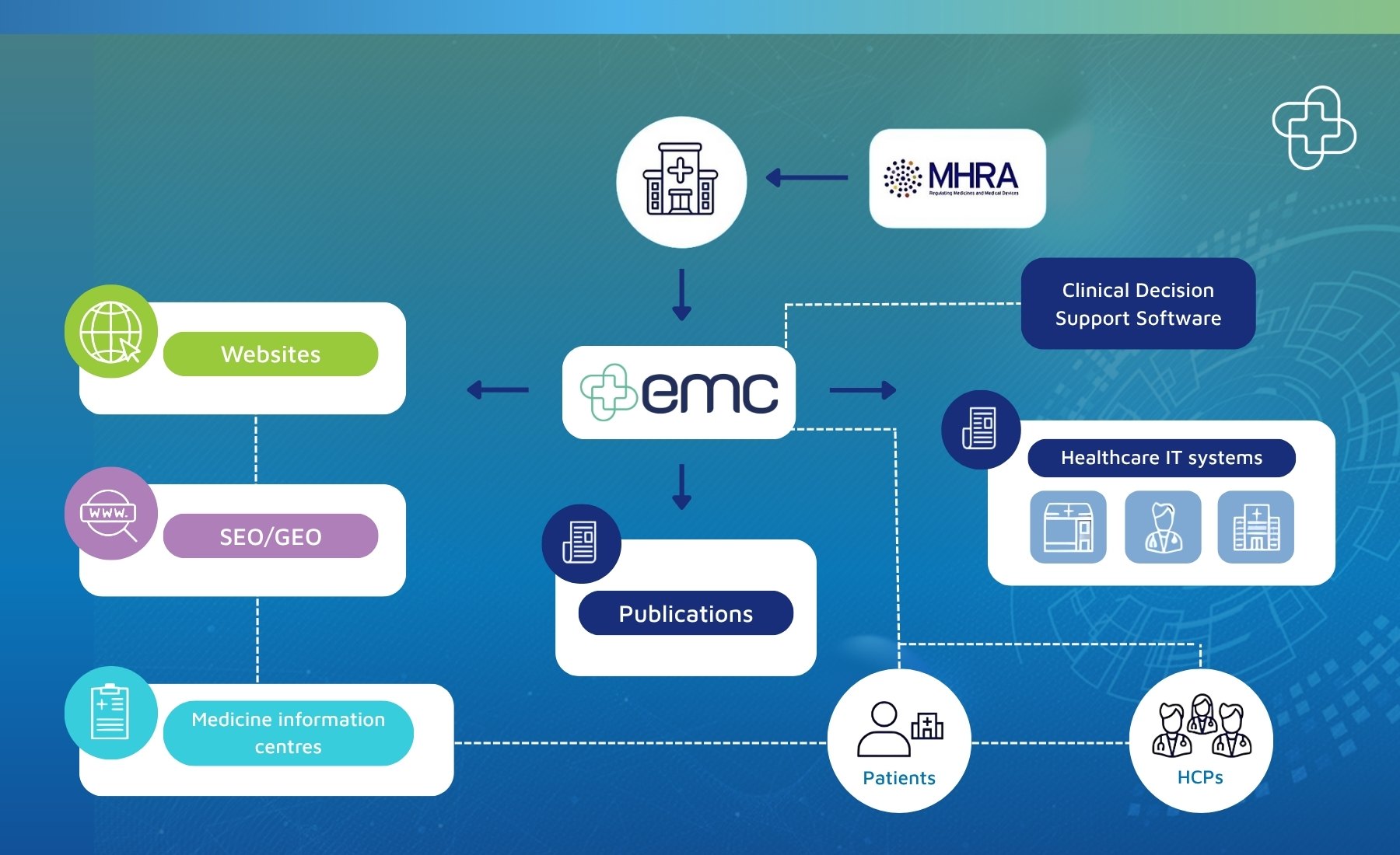 Once you publish your approved content, such as SmPCs and PILs, on emc, this is fed through to health information websites used by HCPs and patients, medicines information publications, and integrated into all the major third-party providers, including GP, hospital and pharmacy IT systems.